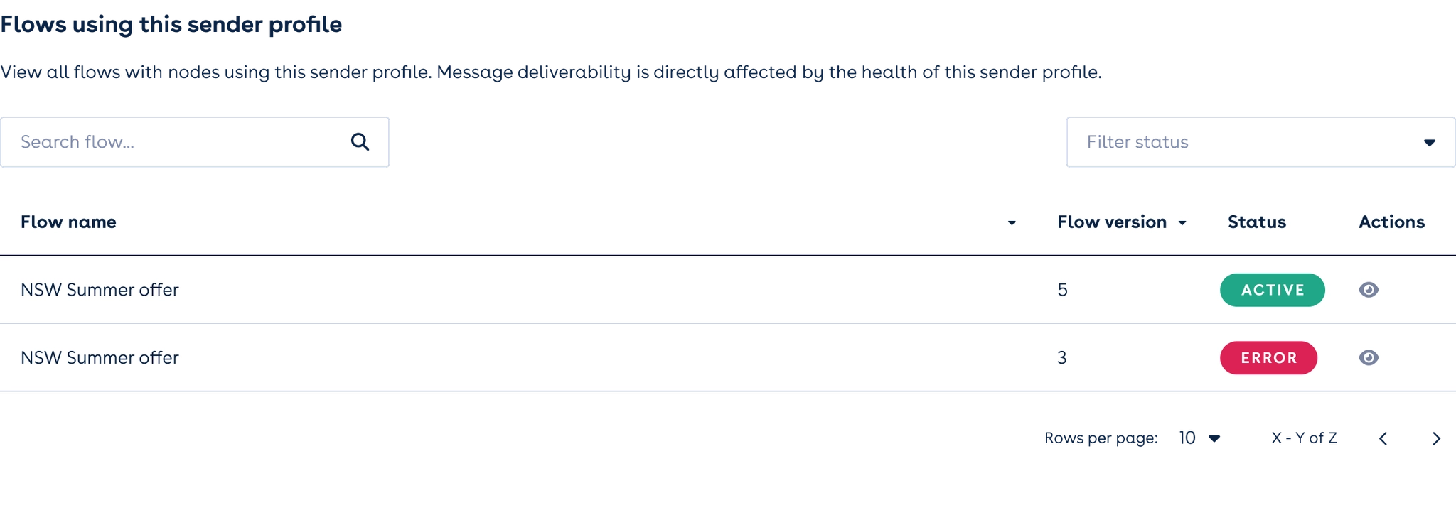 This list excludes flows that reference this sender profile using a merge field. This means there may be active flows using this profile that aren't visible here — keep this in mind before making any changes.
