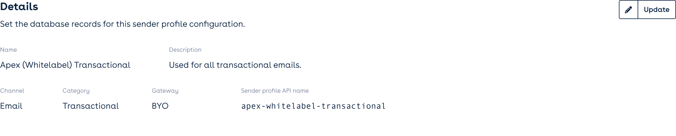 • Sender profile API name – The technical reference which can be used for dynamic sender profile sending. Cannot be changed after creation.