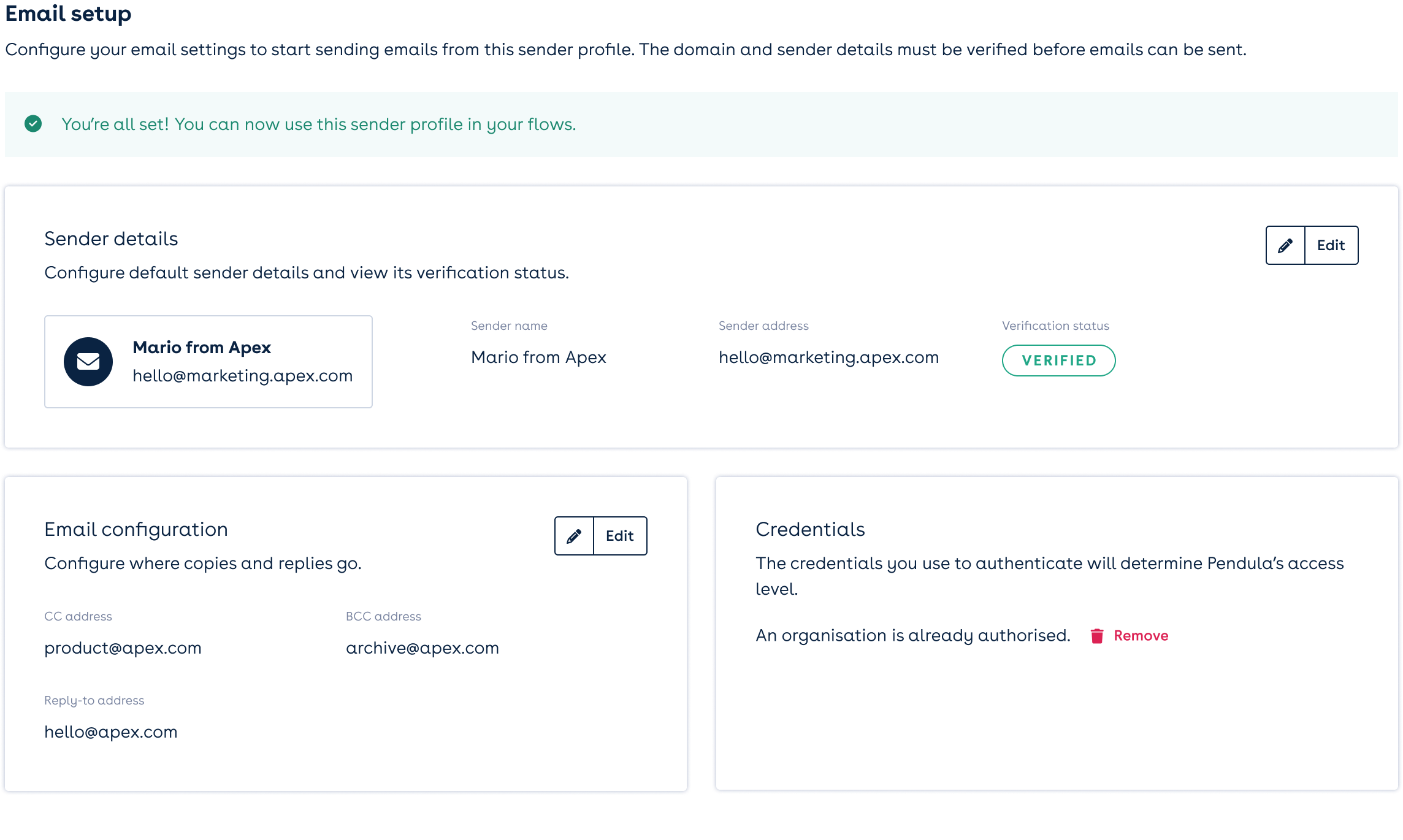 Temporarily disable a sender profile without losing its configuration. Once deactivated, the profile won't be available to select in the Outbound Email node during flow design.